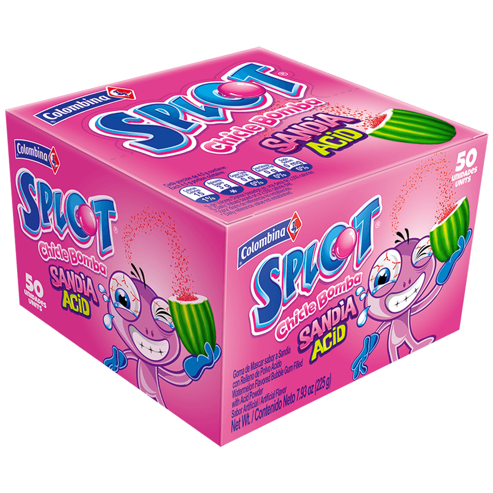 Chicle bomba sabor a sandia con relleno de polvo ácido X 50 unidades.