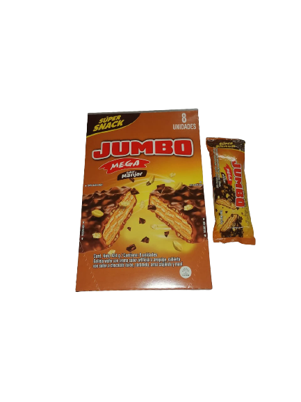 CHOCOLATE JUMBO MEGA , CAJA X 8 UNIDADES, GALLETA WAFER CON CREMA SABOR ARTIFICIAL A AREQUIPE , CUBIERTA CON SABOR A CHOCOLATE DULCE , CARAMELO, ARROZ CRUJIENTE Y MANI.